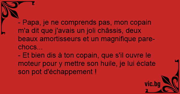 Une fille va voir son père et lui demande : - Papa, je n'ai pas compris, mon copain m'a dis que j'avais châssis, deux beaux amortisseurs et un magnifique pare-chocs. Qu'est-ce que ça veut dire ?...