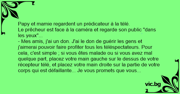 - Mes amis, j'ai un don. J'ai le don de guérir les gens et j'aimerai pouvoir faire profiter tous les téléspectateurs. Pour cela, c'est simple ; si vous êtes malade ou si vous avez mal quelque part, placez votre main gauche sur le dessus de votre récepteur télé, et placez votre main droite sur la partie de votre corps qui est défaillante... Je vous promets que vous serez guéri !
