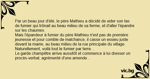 Par un beau jour d'été, le père Mathieu a décidé de vider son tas de fumier qui trônait au beau milieu de sa ferme, et d'aller l'épandre sur les chaumes.