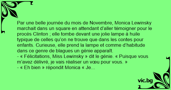 Par une belle journée du mois de Novembre, Monica Lewinsky marchait dans un square en attendant d’aller témoigner pour le procès Clinton ; elle tombe devant une jolie lampe à huile typique de celles qu’on ne trouve que dans les contes pour enfants. Curieuse, elle prend la lampe et comme d’habitude dans ce genre de blagues un génie apparaît.