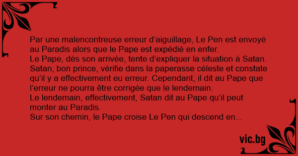 Par une malencontreuse erreur d’aiguillage, Le Pen est envoyé au Paradis alors que le Pape est expédié en enfer.