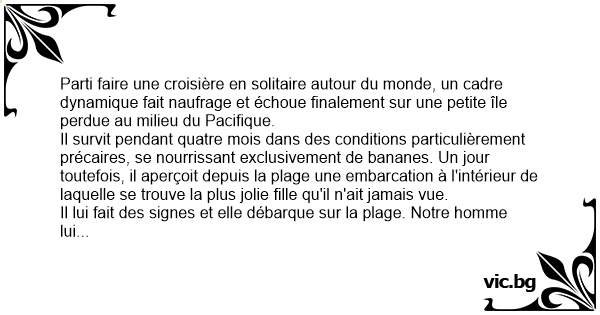 Et la superbe créature lui explique : J'habite de l'autre côte de cette île, j'ai fait naufrage, moi aussi il y a maintenant trois ans...