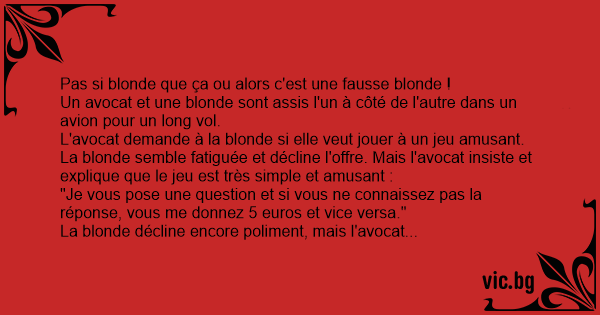 Un avocat et une blonde sont assis un à côté de l’autre sur un long vol de Los Angeles à New York. L’avocat se penche vers elle et lui demande si elle aimerait jouer un petit jeu amusant. La blonde...