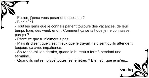 - Tout les gens que je connais parlent toujours des vacances, de leur temps libre, des week-end… Comment ça se fait que je ne connaisse pas ça ?