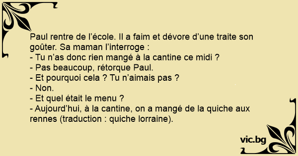 - Aujourd’hui, à la cantine, on a mangé de la quiche aux rennes (traduction : quiche lorraine).