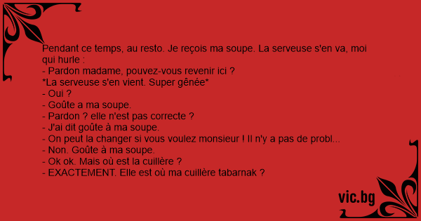 Pendant ce temps, au resto. Je reçois ma soupe. La serveuse s'en va, moi qui hurle :