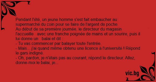 - Oh, pardon, je n'étais pas au courant, répond le directeur. Allez, donne-moi le balai, je vais te montrer.