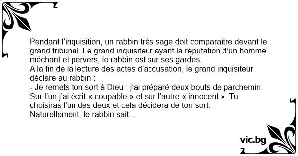 - Très simplement, répond le rabbin, Si sur le papier que je n’ai pas mangé est inscrit le mot « coupable », cela voudra bien dire que le papier que j’ai choisi portait le mot « innocent » et que je dois donc être disculpé.