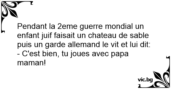 Pendant la 2eme guerre mondial un enfant juif faisait un chateau de sable puis un garde allemand le vit et lui dit: