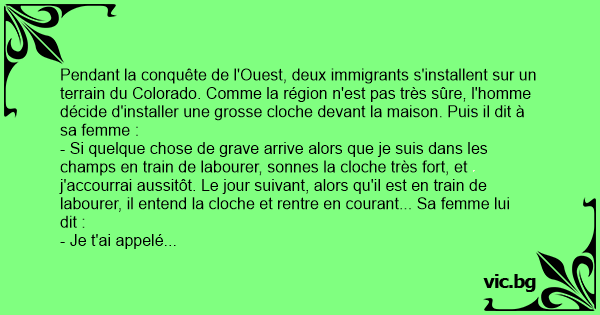 - Je t'ai appelé parce que les enfants étaient vraiment insupportables. Ils n'arrêtent pas de se chamailler ! - Quoi tu m'as fais courir plus de 2 bornes juste pour ça ! Mais t'es folle ! Quelques jours plus таrd, rebelote. la sonne cloche, le fermier accoure aussitôt. Tout essoufflé, il voit sa femme en train de pleurer, devant sa tarte aux mûres toute brûlée. - Bon sang ! Tu veux ma peau ou quoi dit il en colère à sa femme. J'ai dit des choses graves. Je te préviens si tu m'appelles encore pour des conneries, cela va mal ce passer ! Le jour suivant, la cloche sonne à nouveau. Cette fois encore il rentre à la ferme en quatrième vitesse. Lorsqu'il arrive la mère est morte, plantée sur le porche transpercée par une lance, la ferme est en feu, les animaux sont tous morts à coup de flèches et de la mule il ne reste plus que les os... Contemplant le carnage, le fermier dit :