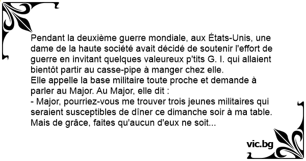 Pendant la deuxième guerre mondiale, aux États-Unis, une dame de la haute société avait décidé de soutenir l'effort de guerre en invitant quelques valeureux p'тiтs G. I. qui allaient bientôt partir au casse-pipe à manger chez elle.