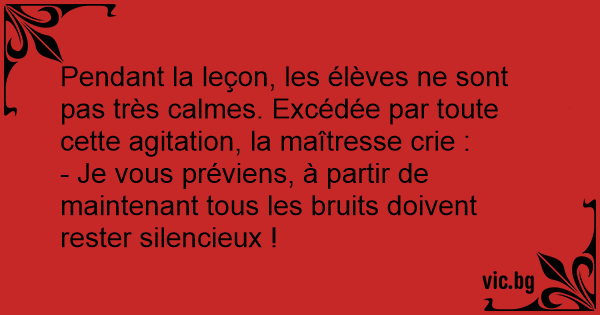 Pendant la leçon, les élèves ne sont pas très calmes. Excédée par toute cette agitation, la maîtresse crie :