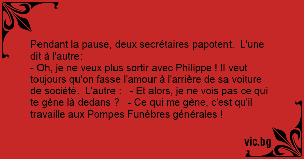 - Oh, je ne veux plus sortir avec Philippe ! Il veut toujours qu'on fasse l'amour à l'arrière de sa voiture de société. L'autre : - Et alors, je ne vois pas ce qui te gène là dedans ? - Ce qui me gène, c'est qu'il travaille aux Pompes Funèbres générales !