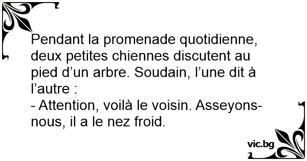 Pendant la promenade quotidienne, deux petites chiennes discutent au pied d’un arbre. Soudain, l’une dit à l’autre :