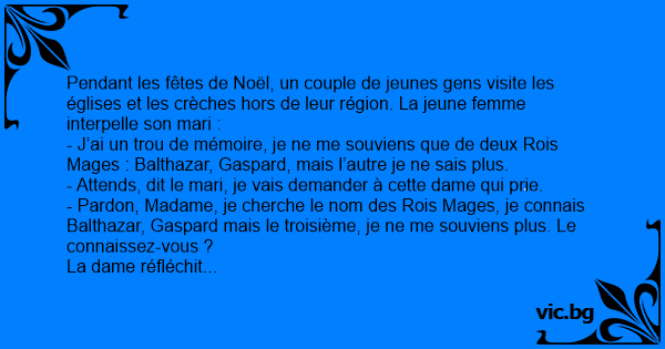 - Pardon, Madame, je cherche le nom des Rois Mages, je connais Balthazar, Gaspard mais le troisième, je ne me souviens plus. Le connaissez-vous ?