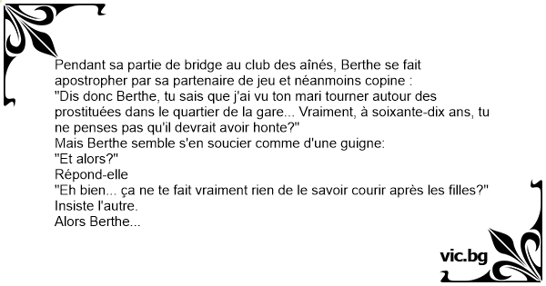 Pendant sa partie de bridge au club des aînés, Berthe se fait apostropher par sa partenaire de jeu et néanmoins copine :