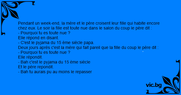 Pendant un week-end, la mère et le père croisent leur fille qui habite encore chez eux. Le soir la fille est toute nue dans le salon du coup le père dit :