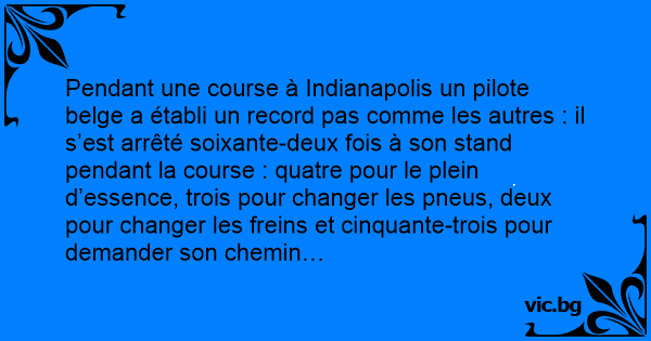 Pendant une course à Indianapolis un pilote belge a établi un record pas comme les autres : il s’est arrêté soixante-deux fois à son stand pendant la course : quatre pour le plein d’essence, trois pour changer les pneus, deux pour changer les freins et cinquante-trois pour demander son chemin…