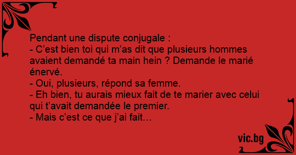 - C’est bien toi qui m’as dit que plusieurs hommes avaient demandé ta main hein ? Demande le marié énervé.