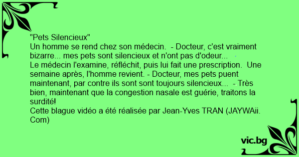 Le médecin l'examine, réfléchit, puis lui fait une prescription. Une semaine après, l'homme revient. - Docteur, mes pets puent maintenant, par contre ils sont sont toujours silencieux... - Très bien, maintenant que la congestion nasale est guérie, traitons la surdité!