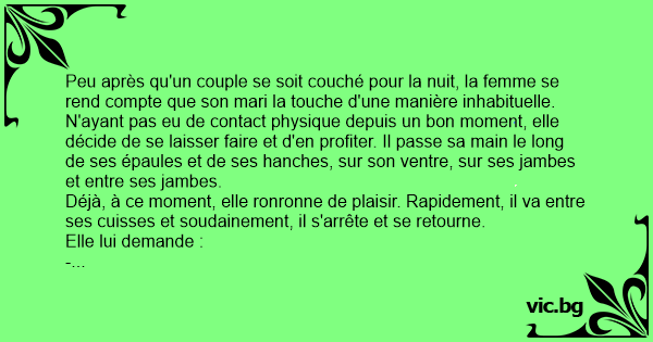 Peu après qu'un couple se soit couché pour la nuit, la femme se rend compte que son mari la touche d'une manière inhabituelle. N'ayant pas eu de contact physique depuis un bon moment, elle décide de se laisser faire et d'en profiter. Il passe sa main le long de ses épaules et de ses hanches, sur son ventre, sur ses jambes et entre ses jambes.