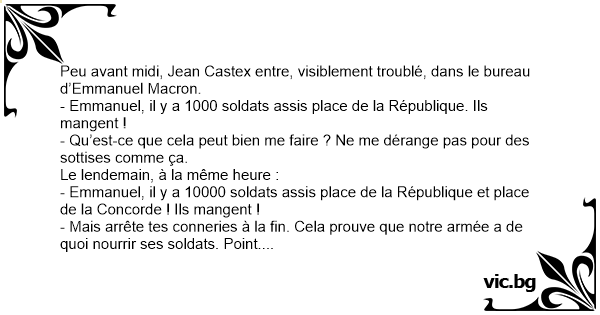 - Emmanuel, il y a 10000 soldats assis place de la République et place de la Concorde ! Ils mangent !