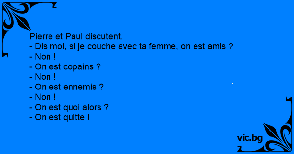 Pierre et Paul discutent.<br />- Dis moi, si je couche avec ta femme, on est amis ?<br />- Non !<br />- On est copains ?<br />- Non !<br />- On est ennemis ?<br />- Non !<br />- On est quoi alors ?<br />- On est quitte !