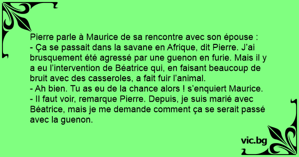 - Ça se passait dans la savane en Afrique, dit Pierre. J’ai brusquement été agressé par une guenon en furie. Mais il y a eu l’intervention de Béatrice qui, en faisant beaucoup de bruit avec des casseroles, a fait fuir l’animal.
