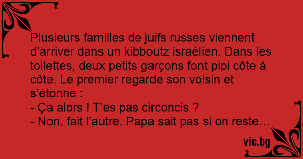 Plusieurs familles de juifs russes viennent d’arriver dans un kibboutz israélien. Dans les toilettes, deux petits garçons font pipi côte à côte. Le premier regarde son voisin et s’étonne :