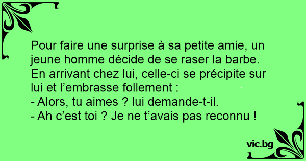 Pour faire une surprise à sa petite amie, un jeune homme décide de se raser la barbe. En arrivant chez lui, celle-ci se précipite sur lui et l’embrasse follement :
