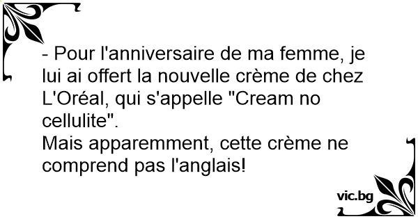 - Pour l'anniversaire de ma femme, je lui ai offert la nouvelle crème de chez L'Oréal, qui s'appelle "Cream no cellulite".