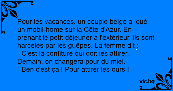 Pour les vacances, un couple belge a loué un mobil-home sur la Côte d'Azur. En prenant le petit déjeuner à l'extérieur, ils sont harcelés par les guêpes. La femme dit :