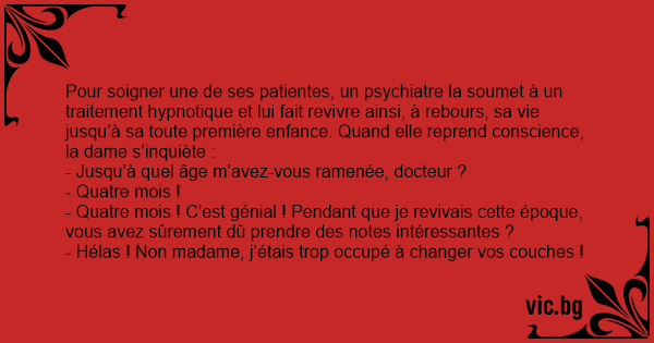 Pour soigner une de ses patientes, un psychiatre la soumet à un traitement hypnotique et lui fait revivre ainsi, à rebours, sa vie jusqu’à sa toute première enfance. Quand elle reprend conscience, la dame s’inquiète :