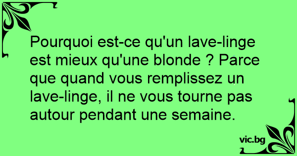 Pourquoi est-ce qu'un lave-linge est mieux qu'une blonde ? Parce que quand vous remplissez un lave-linge, il ne vous tourne pas autour pendant une semaine.