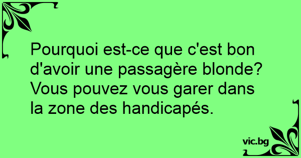 Pourquoi est-ce que c'est bon d'avoir une passagère blonde? Vous pouvez vous garer dans la zone des handicapés.