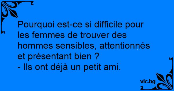 - Защо за жените е трудно да си намерят мъж, който да е грижлив, чувствителен и красив? - Защото тези мъже вече си имат любовник