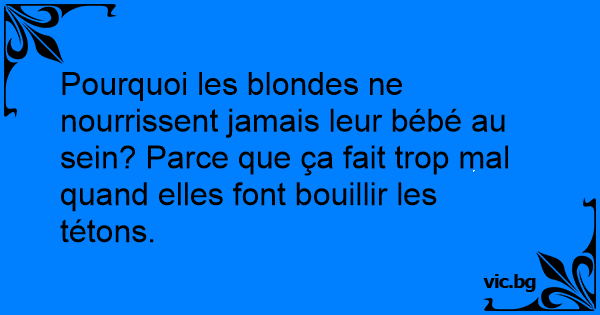 Pourquoi les blondes ne nourrissent jamais leur bébé au sein? Parce que ça fait trop mal quand elles font bouillir les tétons.