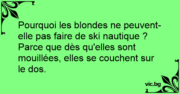 Pourquoi les blondes ne peuvent-elle pas faire de ski nautique ? Parce que dès qu'elles sont mouillées, elles se couchent sur le dos.
