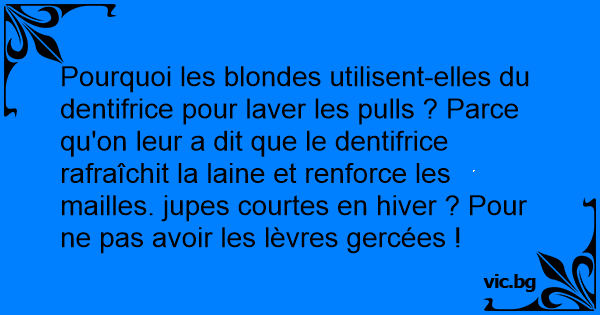Pourquoi les blondes utilisent-elles du dentifrice pour laver les pulls ? Parce qu'on leur a dit que le dentifrice rafraîchit la laine et renforce les mailles. jupes courtes en hiver ? Pour ne pas avoir les lèvres gercées !