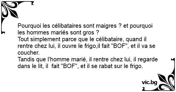 Warum sind Junggesellen schlanker? Unterschied verheiratet oder nicht Gewichtsproblem Γιατί οι παντρεμένες γυναίκες είναι πιο παχουλές από τις ανύπαντρες; Οι παντρεμένοι ΠΑΝΤΡΕΜΕΝΟΙ ΚΑΙ ΕΡΓΕΝΗΔΕΣ Το φως του μπάνιου... Παντρεμένοι-Ανύπαντροι Въпрос: Защо женените мъже надебеляват? Γιατί ο παντρεμένος άντρας ειναι πιο παχύς από έναν εργένη; Каква е разликата между омъжена и неомъжена жена? Защо ергените са по слаби от оженените? Zwei ehemalige Schulkameraden treffen sich nach 30 Jahren wieder. - En fait c'est très simple : Um sujeito gordo e outro magro conversavam. Diz o gordo: — Como é que você consegue se manter assim, magrinho? — É que eu sou solteiro. Quando chego em casa vou para a geladeira e como nunca tem nada que presta, vou para cama. — E você, por que é tão gordo? — É que eu sou casado. Quando chego em... Pourquoi les hommes mariés prennent-ils du poids, alors que les célibataires restent maigres ? - Les célibataires ouvrent leur frigo, ny trouvent rien qui leur plaise, alors ils retournent au lit. - Les hommes mariés vont au lit, ny trouvent rien qui leur plaise, alors ils vont au frigo... What's the difference between a bachelor & a married man? Bachelor comes home, see's what's in the fridge & goes to bed. Married man comes home, see's what's in the bed & goes to the fridge. ¿Por qué un soltero esta más flaco que un casado? Porque el soltero va a la nevera y como no le gusta lo que ve va a la cama. En cambio el casado va a la cama y como no le gusta lo que ve va a... Warum sind Junggesellen schlanker und Ehemänner dicker? Der Junggeselle kommt Nachhause, schaut, was sich im Kühlschrank befindet und genießen dann, was im Bett ist. Der Ehemann kommen Nachhause,... Why are marriend women heavier than single women? Single women come home, see what's in the refrigerator and go to bed. Married women come home, see what's in bed and go to the refrigerator. Hvorfor er det at gifte kvinder de vejer meget mere end single kvinder? – Det er selvfølgelig fordi at single kvinder kommer hjem, ser hvad der er i køleskabet, og går dernæst i seng. Gifte kvinder... Singelkvinnor kommer hem, ser efter vad som finns i kylen och går och lägger sig Gifta kvinnor kommer hem, ser efter vad som finns i sängen och går till kylskåpet Minkä takia parisuhteessa elävät naiset ovat yleensä lihavampia kuin sinkkunaiset? - Kun sinkkunaiset ensin katsovat, mitä jääkaapissa on, he päättävät sitten mennäkin mieluummin sänkyyn. Ja kun... Varför väger gifta kvinnor mer än singelkvinnor? Singelkvinnor kommer hem, ser vad de har i kylskåpet och går i säng, medans gifta kvinnor kommer hem och ser vad de har i sängen och går till... Jaka jest różnica między mężczyzną kawalerem, a mężczyzną żonatym? - Kawaler wraca po ostro zakrapianej nocy do domu, zagląda do lodówki, tam nic ciekawego, idzie do łóżka. Żonaty wraca po ostro... Om welke reden zouden de getrouwde vrouwen steeds verzwaren, terwijl de celibataire vrouwen altijd vermageren? Eigenlijk is dat zeer eenvoudig: - De celibataire vrouw gaat naar de frigo, vindt... Waarom zijn getrouwde vrouwen over het algemeen dikker dan vrouwen die vrijgezel zijn? Vrouwen die vrijgezel zijn komen thuis, kijken wat er in de koelkast staat en gaan naar bed. Getrouwde vrouwen... Quelle est la différence entre un célibataire Maigre et un homme marié gros ? - Quand le célibataire rentre chez lui, il ouvre le frigo, Regarde, dit: Bof et va se coucher. Quand le marié va se... Vet du hva forskjellen på en gift og en singel mann er? En singel mann kommer trøtt og sliten hjem og sjekker hva som er i kjøleskapet før han legger seg i sengen. En gift mann kommer hjem og ser... Miksi naimisissa olevat naiset ovat lihavampia kuin sinkut? - Kun sinkkunainen tulee kotiin, hän katsoo mitä on jääkaapissa ja menee sänkyyn. Kun naimisissa oleva nainen tulee kotiin, hän katsoo... P: Pq o homem casado é mais gordo q o homem solteiro ? Pq o homem solteiro chega em casa, vai para a cozinha, abre a geladeira, ve q tem sempre a mesma coisa e vai durmir e o homem casado chega em...
