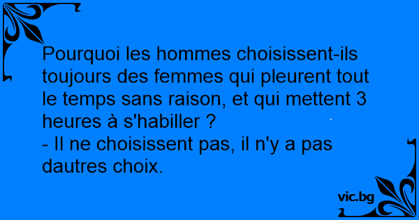 Pourquoi les hommes choisissent-ils toujours des femmes qui pleurent tout le temps sans raison, et qui mettent 3 heures à s'habiller ?