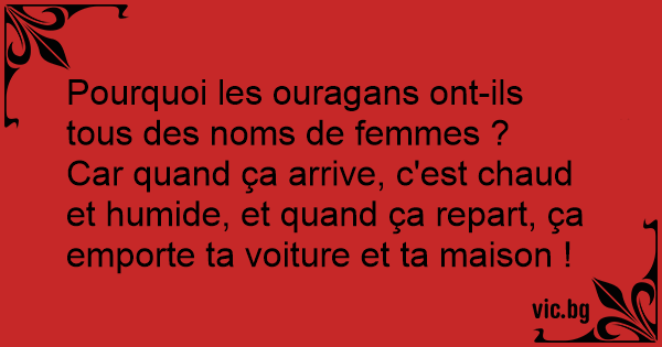 - Varför ger man tropiska orkaner kvinnonamn? - Det är för att de är vilda och våta när de kommer. Och när de försvinner tar de med sig bilen och huset...