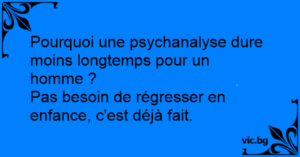 Pourquoi est-ce que la psychanalyse des hommes est plus rapide que celle des femmes ? - Parce qu'il s'agit de remonter dans l'enfance, et avec les hommes, on y est déjà.