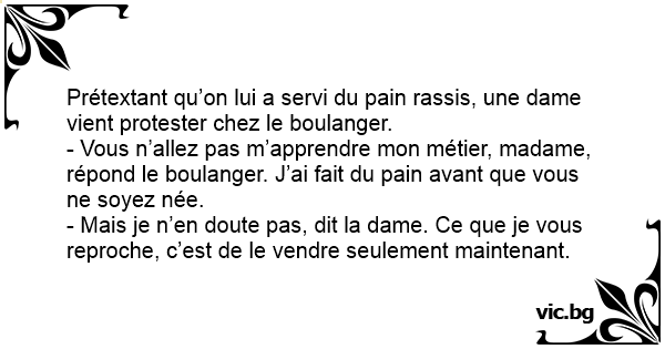 Prétextant qu’on lui a servi du pain rassis, une dame vient protester chez le boulanger. - Vous n’allez pas m’apprendre mon métier, madame, répond le boulanger. J’ai fait du pain avant que vous ne soyez née. - Mais je n’en doute pas, dit la dame. Ce que je vous reproche, c’est de le vendre seulement maintenant.