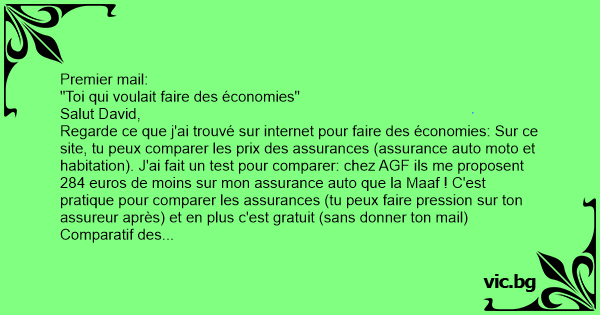 Regarde ce que j'ai trouvé sur internet pour faire des économies: Sur ce site, tu peux comparer les prix des assurances (assurance auto moto et habitation). J'ai fait un test pour comparer: chez AGF ils me proposent 284 euros de moins sur mon assurance auto que la Maaf ! C'est pratique pour comparer les assurances (tu peux faire pression sur ton assureur après) et en plus c'est gratuit (sans donner ton mail)