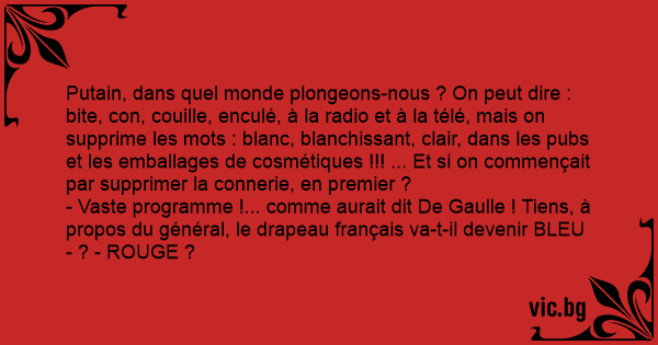 - Vaste programme !... comme aurait dit De Gaulle ! Tiens, à propos du général, le drapeau français va-t-il devenir BLEU - ? - ROUGE ?