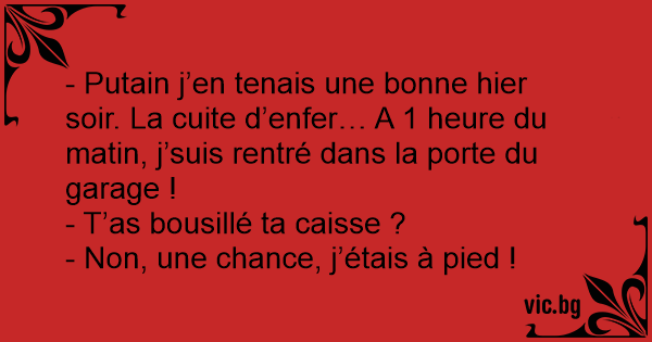 - Рuтаin j’en tenais une воnnе hier soir. La cuite d’enfer… A 1 heure du matin, j’suis rentré dans la porte du garage !