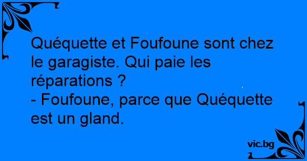 Quéquette et Foufoune sont chez le garagiste. Qui paie les réparations ? - Foufoune, parce que Quéquette est un gland.