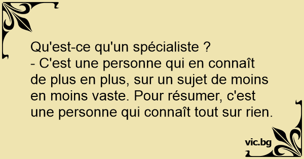 - C'est une personne qui en connaît de plus en plus, sur un sujet de moins en moins vaste. Pour résumer, c'est une personne qui connaît tout sur rien.