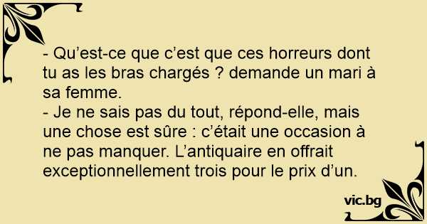 - Je ne sais pas du tout, répond-elle, mais une chose est sûre : c’était une occasion à ne pas manquer. L’antiquaire en offrait exceptionnellement trois pour le prix d’un.